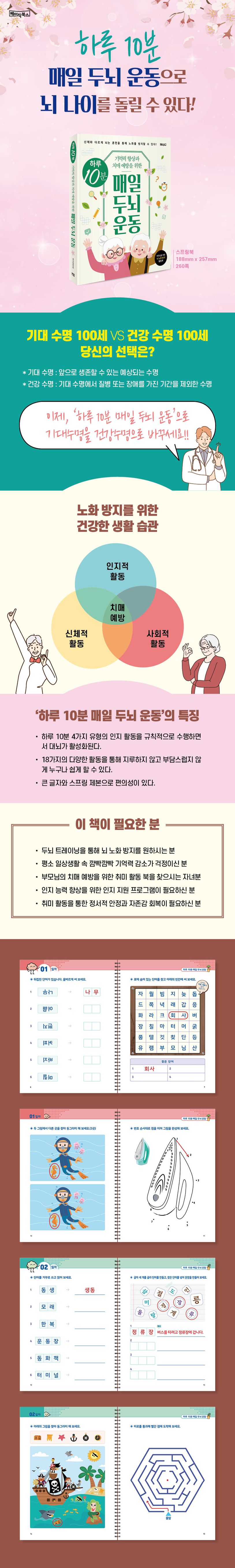 이 책 〈하루 10분 매일 두뇌 운동〉은 언어 영역 활동과 시지각 영역 활동 등 18가지 유형의 문제들을 하루 4문항씩 50일 동안 풀 수 있도록, 총 200문제로 구성되어 있습니다.