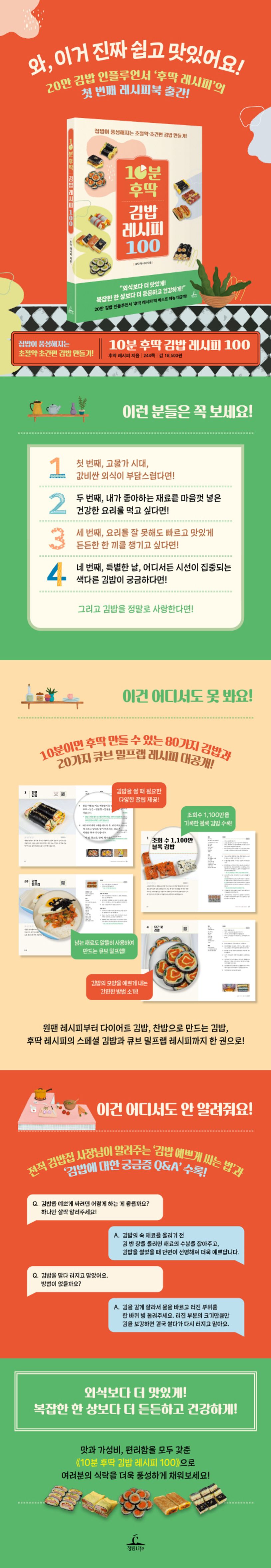 《10분 후딱 김밥 레시피 100》은 남녀노소 누구나 좋아하는 김밥을 10분 만에 손쉽게 완성할 수 있는 100가지 아이디어 레시피를 담았다. 저자 ‘후딱 레시피’만의 특별한 김밥 레시피는 요리 경험이 적은 초보자부터 늘 바쁜 직장인, 혼자 사는 자취생까지 누구나 맛있는 김밥을 만들 수 있도록 도와준다. 특별한 재료 대신 계란, 참치, 스팸, 어묵 등 가장 기본적인 밑반찬 재료를 활용해 맛을 낼 수 있는 초절약 아이디어가 가득하다. 여기에 ‘김밥 만들기에 꼭 필요한 재료’, ‘김밥 예쁘게 싸는 법’, ‘전직 김밥집 사장님이 알려주는 김밥 Q&A’ 등의 팁을 담아, 라면 끓이는 것만큼이나 손쉽게 김밥을 쌀 수 있도록 돕는다.