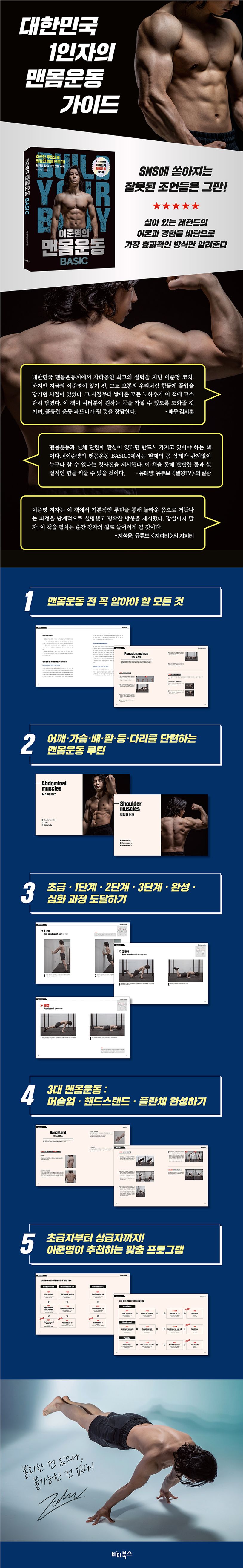 유튜브 채널 ‘이준명’을 운영하며 18만 구독자에게 맨몸운동 튜토리얼을 소개해 큰 호응을 얻고 있는 저자는 인기 방송 프로그램 〈나 혼자 산다〉에서 배우 김지훈을 코치하는 모습으로 더욱 이슈가 되기도 했다. 맨몸운동 대회 우승과 다양한 활동으로 국내를 대표하는 맨몸운동 최강자로 손꼽히는 그가 부상 없이 10년간 맨몸운동을 이어오며 터득한, 가장 효과적이고 안전한 방식의 운동법을 쉽고 간결하게 정리해 출간했다. 저자가 소개하는 운동은 값비싼 장비나 체육관 회원권 없이 언제 어디서든, 하루 30분∼1시간이면 충분히 할 수 있는 초간단 루틴으로 구성되어 있다. 또한 동작마다 지켜야 할 주의 사항을 자세히 수록하고 다양한 각도에서 찍은 자세 사진과 몇몇 동작에는 QR코드도 함께 담아 누구나 쉽게 따라 할 수 있도록 배려했다. 맨몸운동을 처음 시작하는 초급자는 물론 상급자까지 활용 가능한 ‘단계별 맞춤 프로그램’을 통해 최강의 몸을 만들어보자. 이 책이 훌륭한 파트너가 되어줄 것이다.