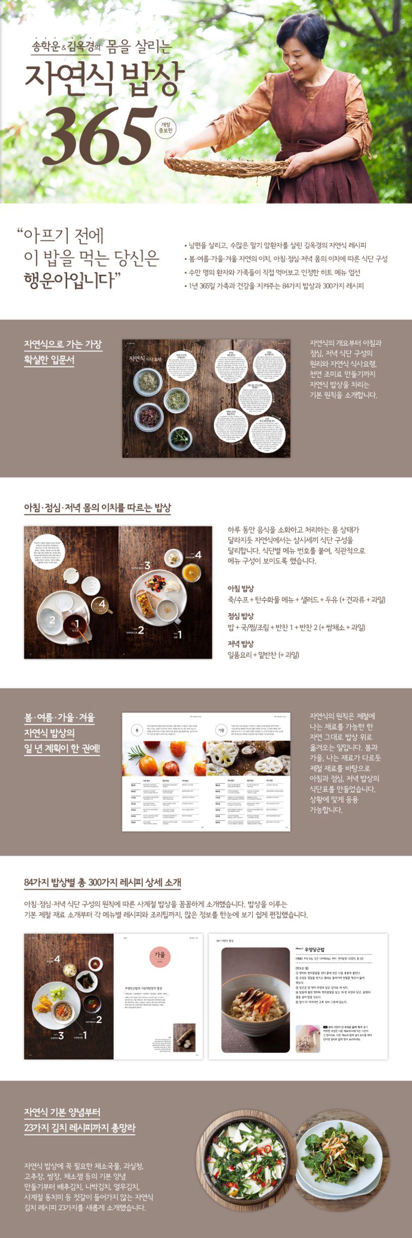 『몸을 살리는 자연식 밥상365』은 23년 전 시한부 말기암 환자라는 죽음의 기로에서 오직 자연식만으로 건강한 삶을 찾은 송학운&김옥경 부부가 안내하는 자연식 입문서이다. 저자인 김옥경 자연식 요리연구가가 안내하는 자연식의 핵심은 하루 24시, 1년 365일이 시시각각 다르듯 자연의 이치, 몸의 조건에 따라 바뀌는 밥상이다. 아침과 점심, 저녁의 식단구성이 달라야 하고, 또 제철 재료가 달라지는 봄, 여름, 가을, 겨울의 밥상이 달라져야 한다고 강조한다.