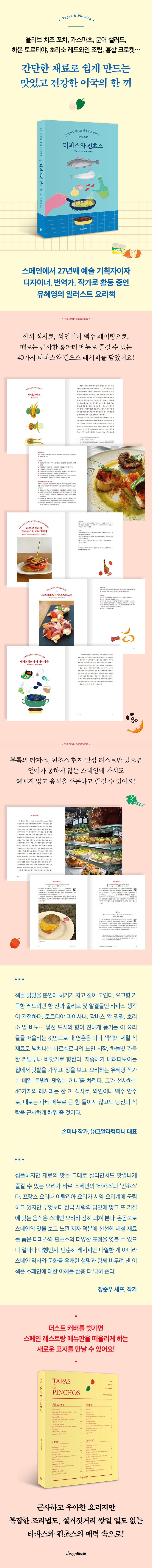 저자가 알려주는 요리는 한 끼 식사가 되기도 하고, 술안주로 가볍게 즐길 수 있고, 손님 접대용으로도 손색없다. 이 40가지 요리를 하나씩 조리하다 보면 스페인의 사계절뿐 아니라 이베리아반도와 지중해의 향취, 여러 지방의 개성 있는 지역색 등 다양한 맛을 경험해 볼 수 있다. 또한 부록에는 타파스 및 핀초스 맛집 리스트를 실어 언어가 통하지 않는 스페인에 가도 수십 개가 되는 메뉴 앞에서 헤매지 않고 음식을 주문하고 현지인들 사이에 앉아 즐길 수 있게 했다. 삼시세끼 늘 같은 식사에서 벗어나 색다른 음식을 먹고 싶을 때, 한국에서 머나먼 이국의 음식을 쉽게 만들고 싶을 때, 음식으로 스페인 여행을 떠나고 싶을 때 이 책을 펼치기만 하면 된다.