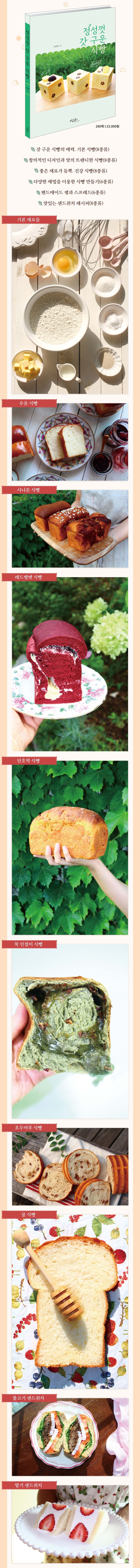 기본 제법인 스트레이트법 이외에 탕종법, 풀리쉬, 묵은 반죽법 등을 소개하면서 단순하지만 심도 있는 식빵을 굽도록 도와주고, 우리나라에서 생산되는 다양한 식빵 틀(기본 식빵 틀 외에 오란다 틀, 마루 식빵 틀, 풀먼 식빵 틀)의 응용법을 설명합니다. 또한 건강한 한 끼를 위하여 에멘탈 치즈, 오징어 먹물, 홍국 쌀 등을 이용한 제법도 다루었습니다.