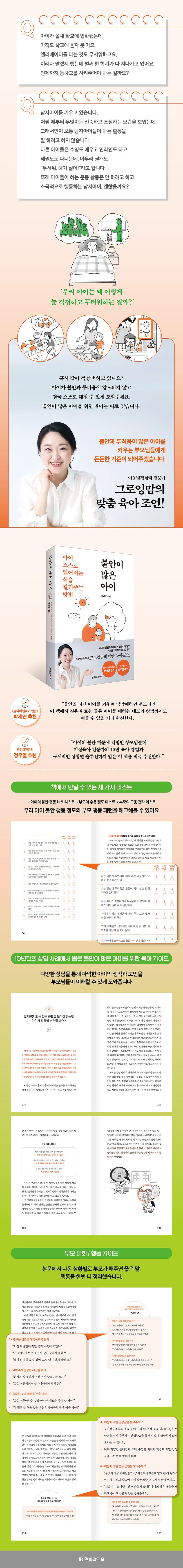 아이가 어릴 때는 부모가 옆에서 도와주고 설득하며 조금씩 나아가게 할 수 있지만 자랄수록 부모가 함께할 수 없는 시간이 더 많다. 그렇기에 결국 우리 아이들이 스스로 불안과 두려움을 이겨내고 해결할 수 있는 내면의 힘을 키워주어야 한다. 이 책은 불안과 두려움이 많은 아이를 키우는 부모들에게, 아이가 자신의 두려운 마음을 인정하고, 조금씩 새로운 일을 시도해 보고 성장하도록 돕는 힘을 길러주는 방법을 알려준다. 아이의 불안과 두려움에 공감해 주는 방법, 아이가 느끼는 불안과 두려움을 구체적으로 표현하는 방법, 막연한 불안의 감정을 성공 경험으로 바꾸어 주는 방법 등 불안도가 높은 아이를 키우는 부모들이 가장 많이 하는 고민에 대한 답을 찾을 수 있을 것이다. 지금은 길이 안 보여 답답하겠지만 책에서 권하는 방법을 하나하나 적용해 가며 조금만 기다려 보자. 결국 아이가 먼저 새로운 경험을 해보려 마음먹는 순간이 올 것이다.