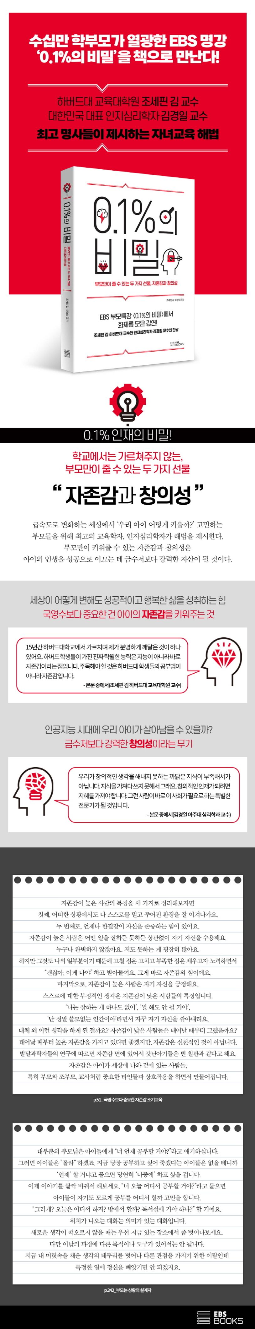 EBS 부모특강 〈0.1%의 비밀〉에서는 빠르게 변화하는 시대에 아이를 키우며 불안해하는 부모들에게 그 답을 들려주었다. 부모만이 키워줄 수 있는, 아이들에게 필요한 역량은 바로 자존감과 창의성이다. ‘자존감 전도사’인 하버드대 교육대학원 조세핀 김 교수와 창의성을 연구해온 인지심리학자 김경일 교수가 그 비밀을 밝힌다. 방송이 나간 후 두 교수의 강의들은 자녀를 둔 부모들에게 폭발적인 반응을 얻었다. 강의에서 나눈 소중한 혜안을 더 많은 사람과 나누기 위해 책으로 엮었다. 강의 내용뿐 아니라 방송에 미처 나가지 못한 내용과 보충한 자료들을 정리해 아이 교육에 고민하는 부모들에게 명쾌한 해답과 새로운 시각을 전한다.