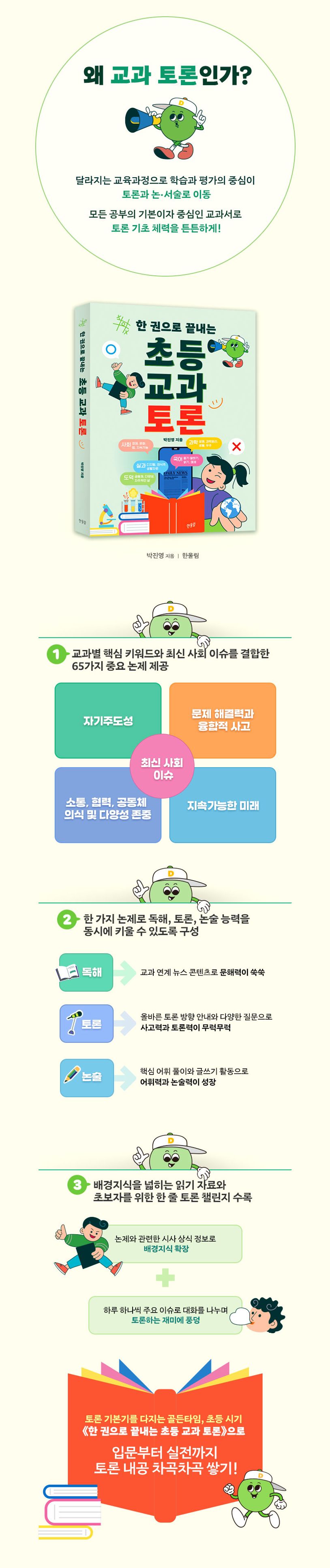 이 책은 국어, 사회, 과학, 도덕, 실과 등 주요 과목의 내용 체계를 분석하고, 그 핵심 내용을 최근 사회 이슈와 연결하여 한층 깊이 있고 폭넓은 토론이 이루어질 수 있도록 이끄는 ‘교과 토론’ 책이다. 과목별 교과 내용은 물론이고, 초등 아이들의 호기심과 흥미, 세상을 보는 시각, 올바른 가치관을 고려한 65가지 토론 주제를 엄선하여 담았다. 교과서에 담긴 좋은 질문과 생각 훈련을 바탕으로 한 융합적이고 복합적인 논제들은 아이들이 교과서 중심의 토론 학습에 익숙해지도록 도울 것이다.