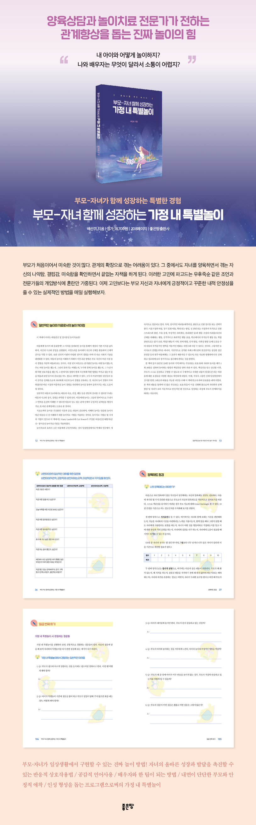양육전문가가 제안하는 가정 내 특별놀이 워크북. 언어가 미숙한 아동은 감정, 생각을 표현하고 자기 자신을 인식하는 것에 어려움을 겪는다. 가정 내 특별놀이는 놀이로써 아동이 감정, 생각을 자유롭게 표현하게 함으로써 자기조절력을 기르게 하고, 부모가 자녀를 온전하게 이해하도록 한다. 비싼 장난감이나 교구가 없어도 책에서 제안하는 방법을 따라 자녀와 함께 놀이를 하다 보면 부모-자녀의 관계를 진전시킬 수 있을 뿐만 아니라 부모는 효능감을, 자녀는 자신감을 가질 수 있게 된다.