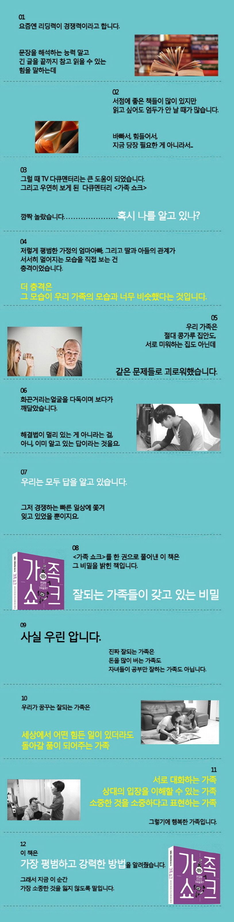 EBS 다큐프라임 9부작 대기획이자 인성 및 부모 교육 시리즈의 완결판 『가족 쇼크』. ‘왜 유독 요즘 가족은 이렇게 서로를 힘들어할까’라는 문제의식에서 시작한 《가족 쇼크》는 주변 가족을 직접 찾아가 내면의 현 모습을 살펴보고, 국내 최초 가족 실험을 통해 행복한 가족, 잘되는 가족이 만들어지는 조건을 본격적으로 탐구한다. 가족의 다양한 위기 상황들을 교육, 심리, 사회학적 관점에서 폭넓게 조명하고, 가족의 근간을 돌아봄으로써 가족의 진정한 의미와 새로운 가치를 찾도록 도와준다.