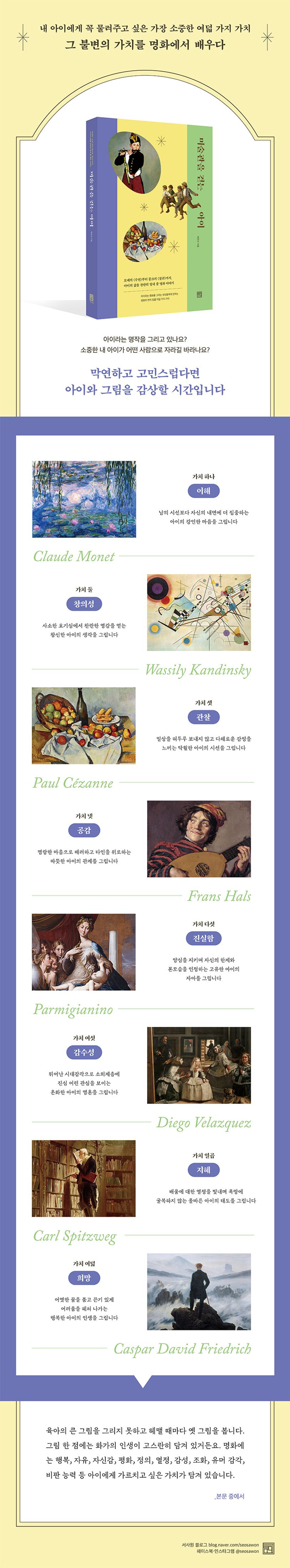 책은 아이에게 꼭 물려주고 싶은 여덟 가지 가치를 소개합니다. ‘이해, 창의성, 관찰, 공감, 진실함, 감수성, 지혜, 희망’입니다. 그리고 이 가치를 엿볼 수 있는 명화들을 소개하지요. 모네의 〈수련〉부터 뭉크의 〈절규〉까지, 친숙하기에 쉽게 지나쳤던 그림들이 대부분입니다. 작가는 그림을 그린 화가의 인생과 작품 속 이야기들을 차근차근, 다정히 들려 줍니다. 아이와 함께 감상하며 생각해 볼 만한 주제와 이야기도 담았습니다. 부모뿐만 아니라 아이도 함께 열린 마음으로 감상하며 대화할 수 있도록요.