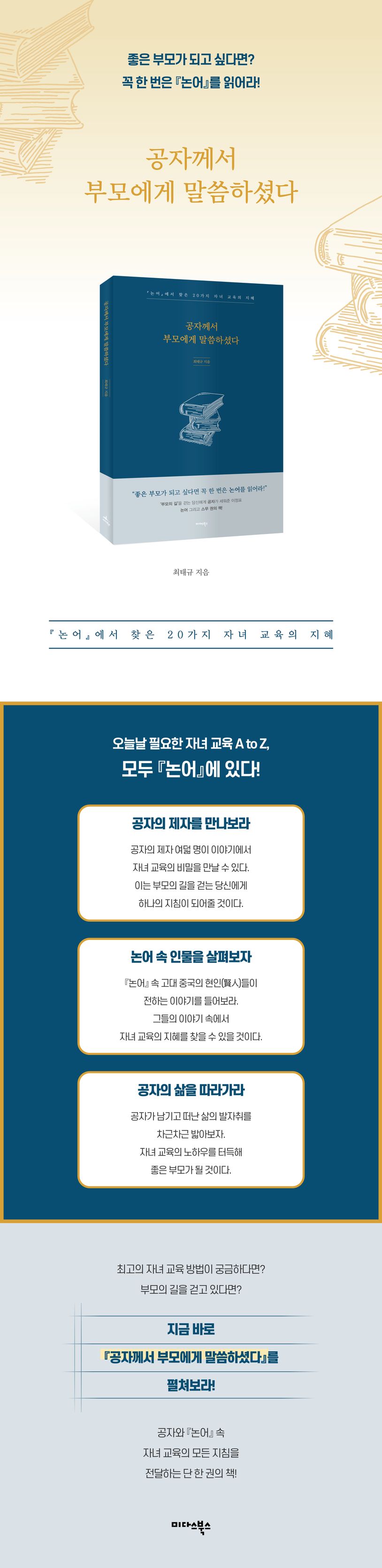 진정으로 자녀를 위해 배우고자 한다면 검증된 최고의 스승, 공자를 찾아가 보자! 『논어』 속 공자의 이야기를 천천히 묻고 차근차근 생각하다 보면 어느새 자녀 교육의 해답을 찾을 수 있을 것이다. 그리고 『공자께서 부모에게 말씀하셨다』가 전하는 스무 권의 책은 『논어』 만큼이나 자녀 교육의 지혜를 찾는 부모의 길에 분명 큰 도움이 될 것이다.