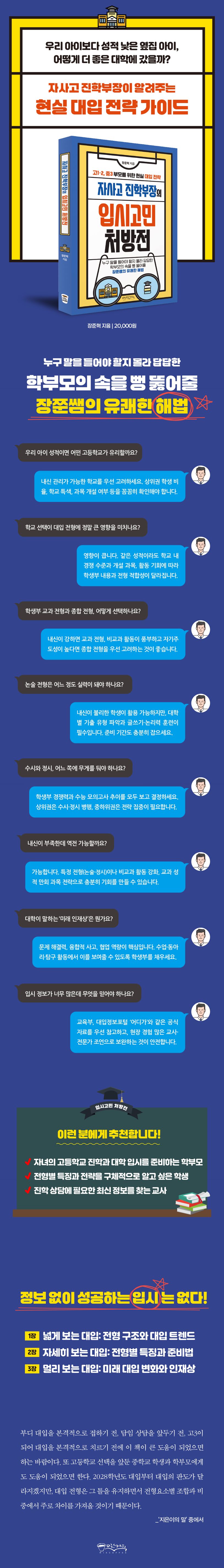 자율형사립고 진학부장인 저자는 이러한 정보의 불균형을 해소하기 위해 현실 대입 전략을 준비하는 책을 집필했다. 우리나라에서는 정보력의 차이가 입시 결과에 큰 영향을 미친다. 새로운 입시 제도를 정확하게 알아야 아이의 대학이 달라진다. 쏟아지는 정보 속에서 불안해하지 않고 주체적으로 정보를 해석하고 대응하는 힘이 필요한 이유다.
