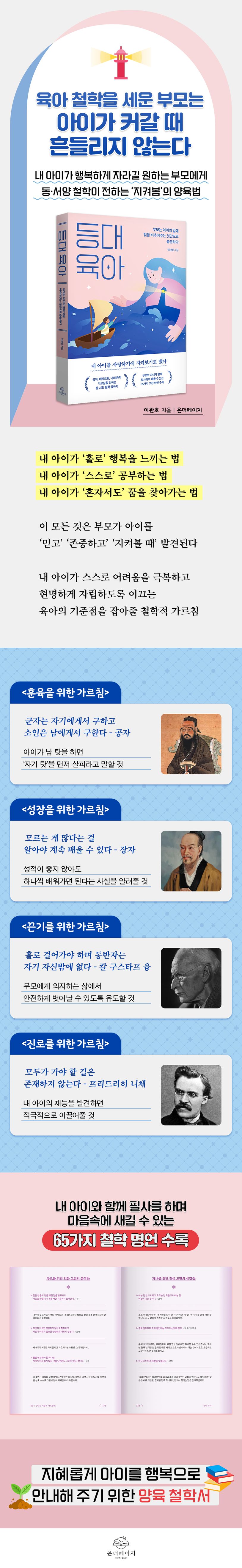 철학적 메시지로 많은 사람에게 위로와 지혜를 전해온 저자는, 이번 책에서 ‘지켜보는 양육법’을 부모들에게 말한다. 동·서양 철학을 재해석해 자녀를 키우면서 맞닥뜨리는 고민을 해결하고 현명한 양육관을 세울 수 있는 가르침을 전한다. 『논어』에서 전하는 아이의 건강한 친구 관계 형성법, 철학자 데카르트가 이야기하는 이 시대 아이들에게 꼭 필요한 융합적 사고방식, 장자가 권하는 진정한 자율주도학습법 등 현대에도 적용할 만한 현명한 양육관을 이 책에서 배울 수 있다. 더불어 고전 명저인 『에밀』, 『격몽요결』 등을 인용해 현명한 양육이란 무엇인지를 이야기한다. 그리고 이러한 철학적 가르침을 다시 한번 마음속에 새길 수 있도록 65가지 명언을 필사할 수 있는 공간을 제공한다.