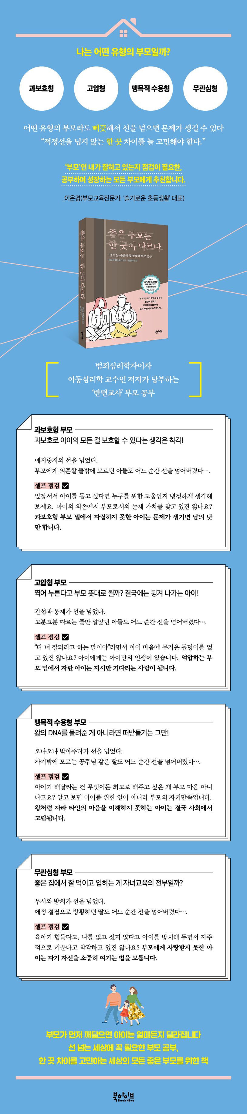 부모라면 누구나 이 네 가지 부모 유형 가운데 어느 하나에 속하기 마련이고 이러한 양육 태도 자체로 문제가 발생하지는 않는다. 다만, 작은 차이로 선을 넘었을 때 불행한 결과를 불러올 수 있다는 점에서, 나는 어떤 유형의 부모이고 지나치게 한쪽으로 쏠려 있지는 않은가 부모 자신의 양육 태도를 끊임없이 되돌아볼 필요가 있다.