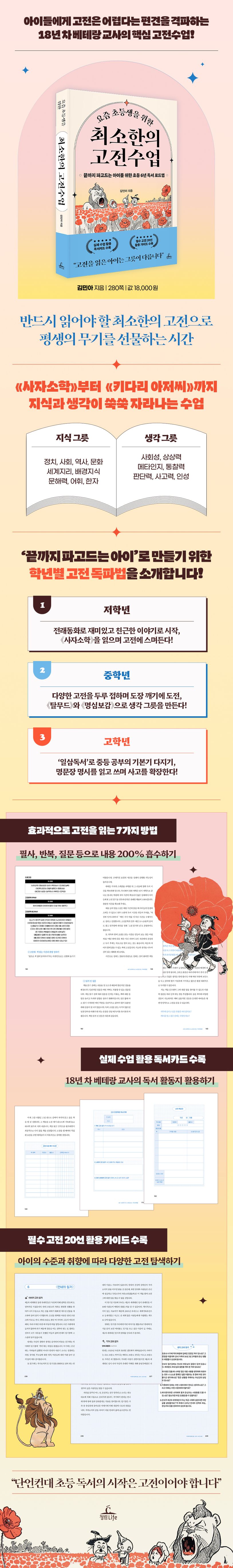 18년 차 베테랑 초등 교사인 ‘똑쌤’ 김민아 선생님이 고전을 어려워하는 부모와 아이의 고민을 타파하고자 요즘 초등생이 고전을 효과적이고 재미있게 읽을 수 있는 핵심만을 뽑아 《요즘 초등생을 위한 최소한의 고전수업》으로 정리했다. 이 책은 학년별 적기 독서법, 독서 효율을 200% 높이는 방법, 필수 고전 20선 가이드 소개 등으로 고전이 어려웠던 이들을 위한 맞춤 구성을 제공한다. 더불어, 고전을 읽으며 키울 수 있는 핵심 역량 여덟 가지와 고전을 입체적으로 읽는 다양한 방법을 친절하게 소개한다.