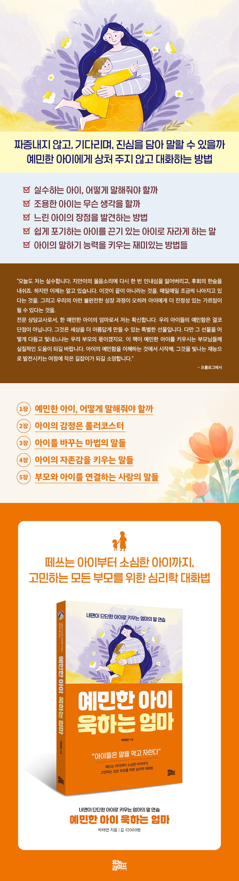 예민한 아이는 보통 아이들과 다르다. 소심하고, 더 쉽게 상처받고, 친구에게 다가가기를 주저하고, 화내는 것도 서투르다. 예민한 아이를 키우는 엄마는 다른 엄마들보다 더 힘들다. 다른 아이보다 느린 것 같고, 외향적이지도 않은 아이를 어떻게 키워야 할지 고민스럽다. 그래서 예민한 아이를 둔 엄마들은 쉽게 욱하고, 뒤돌아서 후회하고 자책한다.