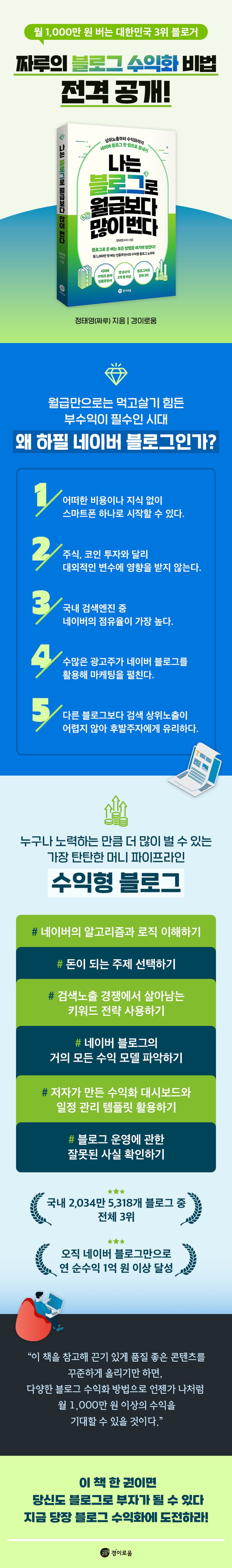 대한민국 전체 3위 파워블로거이자 네이버 IT테크 분야 1위 인플루언서인 짜루가 드디어 블로그 수익화 방법의 거의 모든 노하우를 전격 공개한다. 수많은 머니 파이프라인 중 수익형 블로그가 어떤 장점이 있는지부터 블로그 수익화를 위해 어떻게 콘텐츠를 제작해야 하는지, 블로그로 돈 버는 다양한 방법은 무엇인지, 블로그 수익화에 도움 되는 자료 제공과 블로그 운영에 관한 잘못된 정보 팩트체크까지, 대한민국 최고의 블로거가 가진 비법을 아주 구체적으로 담았다.