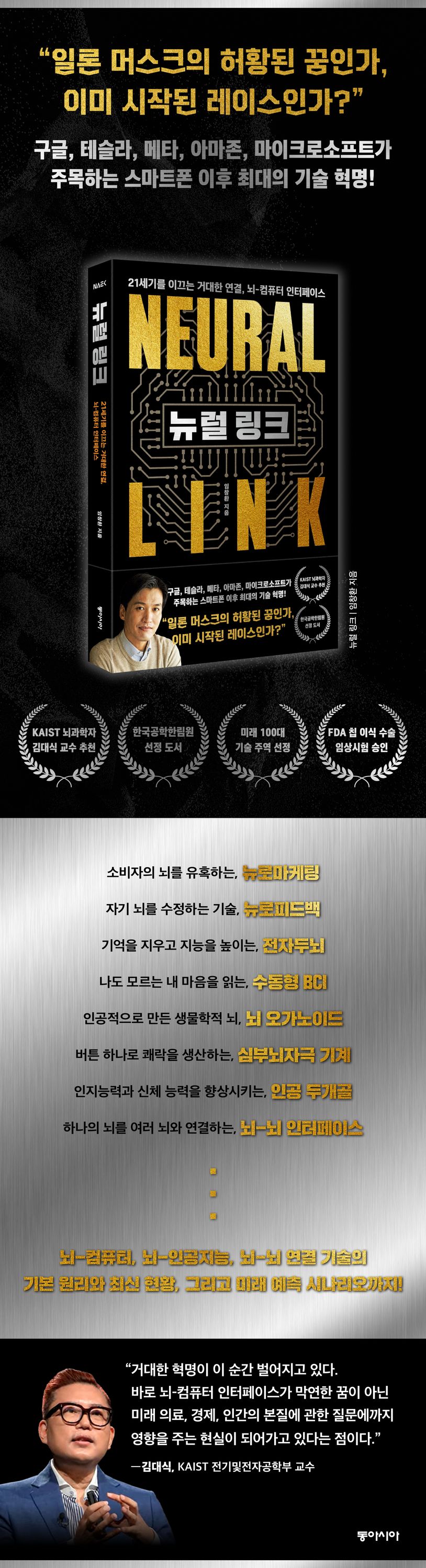 “대부분의 뇌공학자들은 뇌-컴퓨터 인터페이스 기술을 ‘인류의 미래를 바꿀 혁신’이라고 말하는 데 일말의 주저함도 없다. 가깝게는 고령화 시대의 가장 큰 숙제인 치매를 비롯한 각종 뇌 질환을 치료하기 위한 수단으로서, 멀게는 인류의 본능인 인위적인 진화를 달성하기 위한 수단으로서 뇌-컴퓨터 인터페이스 기술이 지닌 엄청난 잠재력을 알기 때문이다. 인류 역사에서 스마트폰이나 인공지능의 등장만큼이나 엄청난 파급력을 끼칠 뇌-컴퓨터 인터페이스의 세계로 여러분을 초대한다.”