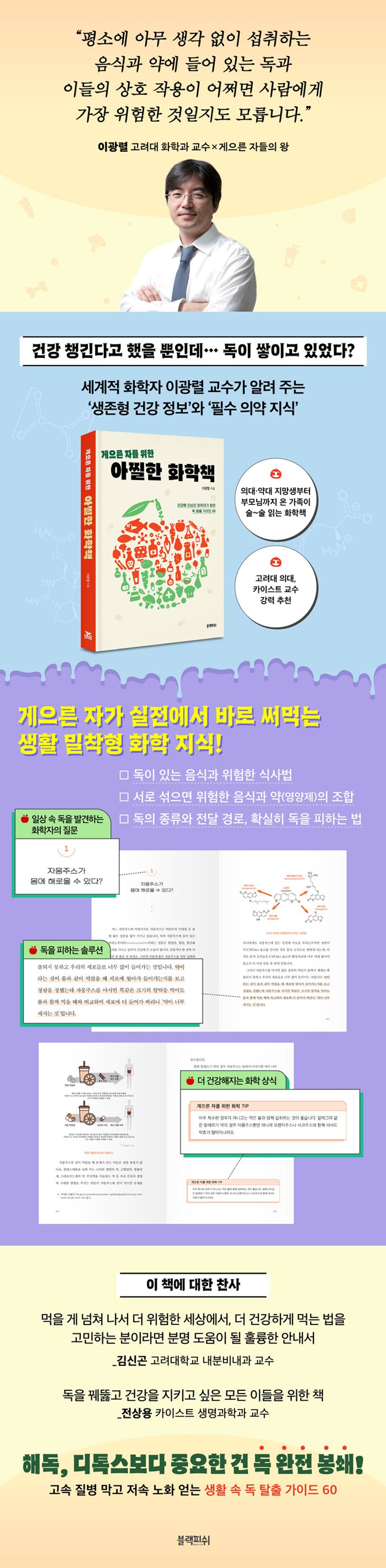 일명 게으른 자들의 왕으로서 여러 저서와 강의를 통해 유쾌한 화학적 꼼수로 많은 사람들을 ‘집안일’에서 해방시켜 온 고려대학교 화학과 이광렬 교수가 이번에는 ‘건강’에 주목했다. 이 책 《게으른 자를 위한 아찔한 화학책》에서 우리가 일상에서 무심코 접하기 쉬운 독을 적극적으로 피하는 법을 화학자의 시각에서 분석해 알려 주고, 독과 세포의 원리 등 깊이 있는 의학·화학 정보까지 특유의 위트 넘치는 문체로 전한다. 본문 1부는 흔히 볼 수 있지만 의외로 독을 품은 음식, 개별적으로는 건강에 좋지만 함께 먹으면 위험한 음식들 혹은 음식과 약(또는 영양제) 조합, 독을 만드는 섭취·조리법 등을 전한다. 예를 들어 강낭콩은 단백질이 풍부하지만 익히지 않고 먹으면 속이 메스껍거나 토하는 등 독성에 의한 증상이 나타날 수 있다. 이 외에도 자몽주스, 인슐린, 고혈압약 등 일상에서 섭취하는 것들이 어떤 경우에 독이 되고 약이 되는지 구체적으로 짚어 준다. 책을 읽다 보면 “내가 명을 재촉하고 있었다니!” 혹은 “이 좋은 걸 잘못 먹고 있었네!” 등의 탄식이 나올 수 있다.