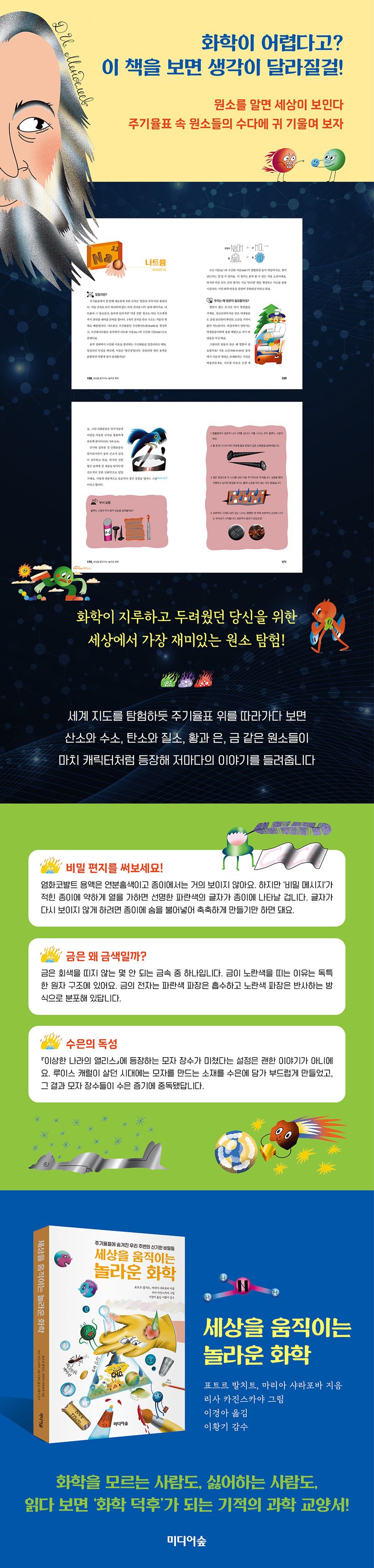 가장 단순한 원소인 수소를 시작으로 헬륨의 태양 기원, 리튬의 레모네이드, 베릴륨이 들어간 에메랄드, 슬라임을 만들어주는 보락스까지…, 각 원소는 살아있는 캐릭터처럼 등장하며, 과학자들의 실수와 발견은 마치 모험 이야기처럼 흥미진진합니다. 그 사이사이로 독자들은 부엌에서 전기 전도 실험을 해 보고, 달걀흰자에 산(酸)을 떨어뜨리고, 은현잉크로 비밀 편지를 쓰며, 과학과 조금씩 가까워집니다. 게다가 이 모든 설명은 위트 있고 친근하면서도 개성이 넘치는 멋진 삽화와 함께합니다.