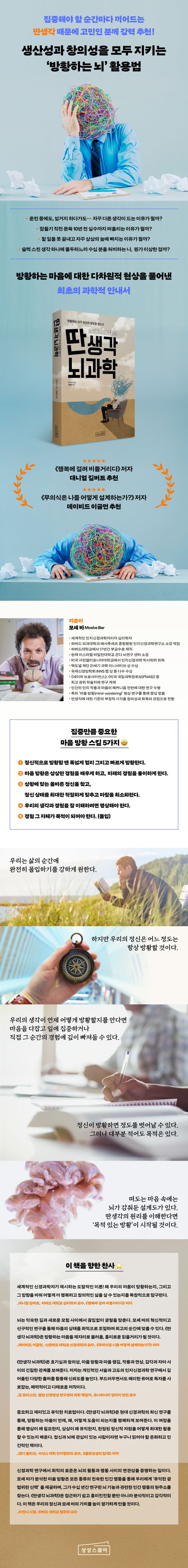 우리 뇌는 끊임없이 소리 없는 소음을 만들어낸다. 특정 영역은 늘 공상에 빠지거나 미래를 걱정하거나 자기 자신과 대화를 나누는 등 무의식적인 활동으로 분주하다. 이러한 활동은 우리가 깨어 있는 시간에서 최대 47%를 차지한다. 바로 ‘마음 방황mindwandering’이다. 이 현상은 때때로 현재의 집중력을 방해하며 불안이나 우울증을 유발할 수도 있지만, 세계적인 인지신경과학자 모셰 바Moshe Bar는 이러한 무질서함 뒤에 숨어 있는 경이로운 원리와 그 이유를 소개한다.