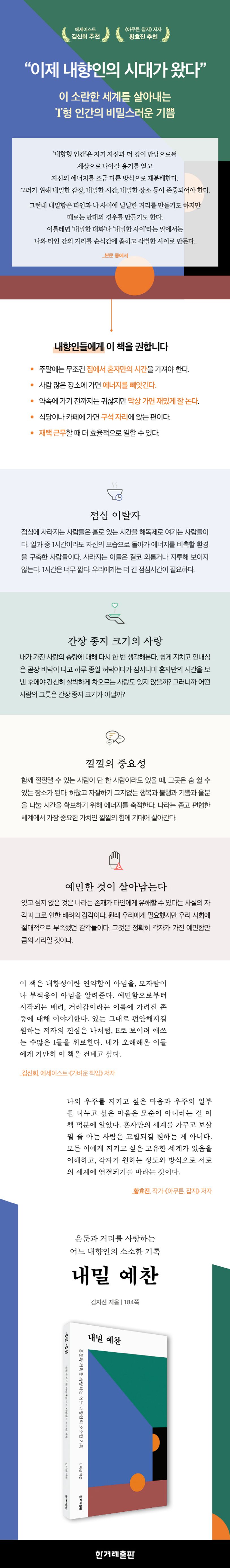 이제 ‘내향형 인간’의 시대가 왔다. 첫 산문집 《우아한 가난의 시대》(2020년 문학나눔 선정도서)에서 MZ세대의 만성적인 빈곤감과 우아한 삶을 향한 욕망에 관해 이야기했던 김지선 작가가 이번 책에서는 내향인의 거리두기와 내밀한 삶에 관해 이야기한다.