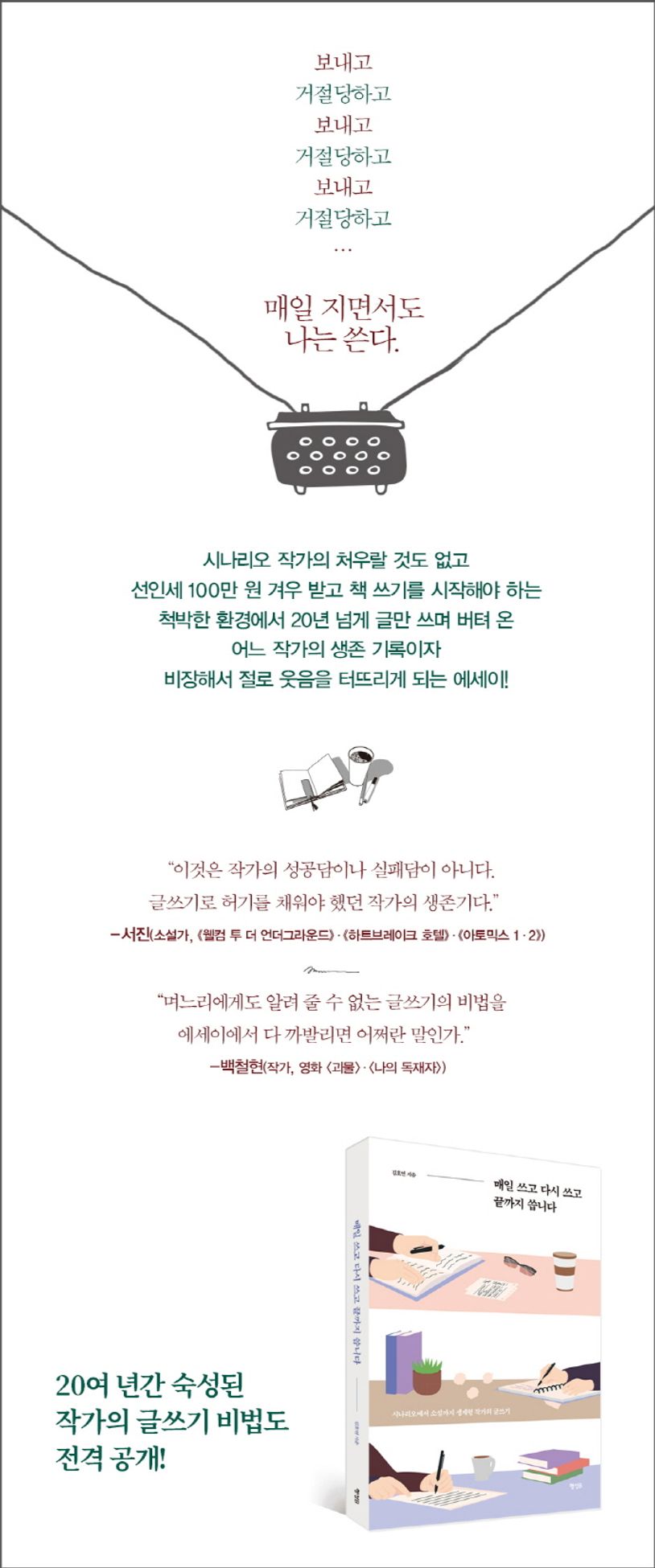 《망원동 브라더스》로 유명한 소설가 김호연의 첫 산문집이다. 20년간 글만 써서 먹고살아 온 작가의 생존기다. 시나리오, 만화 스토리, 소설 등을 쓰며 버텨 온 자신의 삶을 연대기로 들려준다. 쓰고, 반려되고, 쓰고, 반려된 ‘실패의 날들’에 대한 기록이다. 그럼에도 그가 계속 글을 쓰는 이유는 이것 말고는 다른 일을 할 수 없는 직업이 되었기 때문이고, 근본적으로는 ‘근원적인 허기’를 채우기 위해서다. 자신처럼 작가의 길에 들어서려는 이들에게 글쓰기 비법과 공모전 합격 노하우 등 요긴한 정보도 알려 준다. 특히 시나리오 작가로 오래 일한 만큼 영화 한 편이 만들어지기까지 과정도 자세히 보여 준다. 생존기지만 비장하지 않고 유머러스하다.