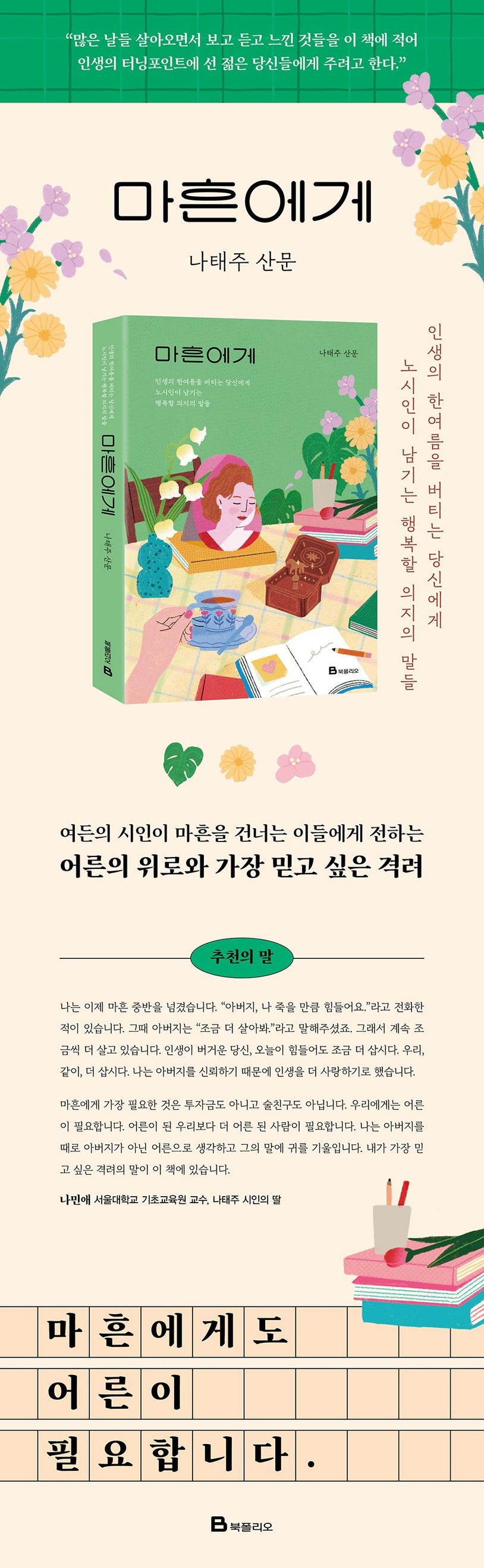 노시인이 전하고픈 이야기는 인생 수업이라거나 인생 철학이라거나 하는 거창한 이야기가 아니다. 그저 마흔의 삶을 건너면서 감겨드는 작고 사소한 이야기들이다. 불어오는 바람, 지나가는 흰 구름, 피어 있는 꽃 한 송이에서도 감사와 행복을 말하는 시인의 목소리에서 우리는 지금의 인생을 기꺼이 사랑하는 힘을 배우게 된다. 이제 겨우 어른이라고 불릴 만한 마흔보다 두 배를 더 산 진짜 어른이 주는 위로와 격려, 인생의 뜨거운 한여름을 건너는 마흔에게 무엇보다 필요한 힘이 되어줄 것이다.