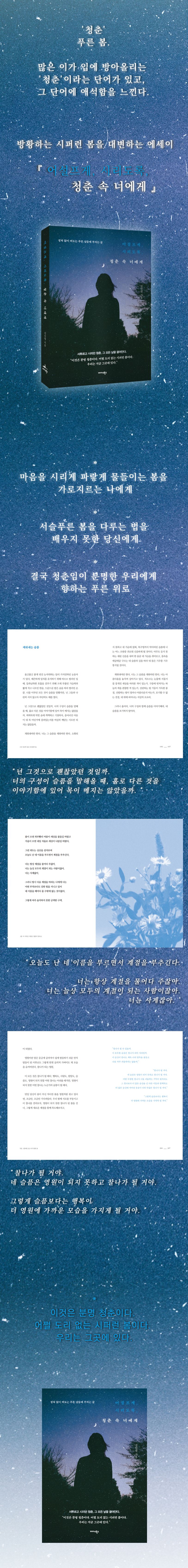 어설펐지만 그래서 더욱 단단했던, 그리고 여전히 마음속에서 시린 그날의 ‘나’를, 오늘 『어설프게, 시리도록, 청춘 속 너에게』가 다시 만나게 해줄 것이다.