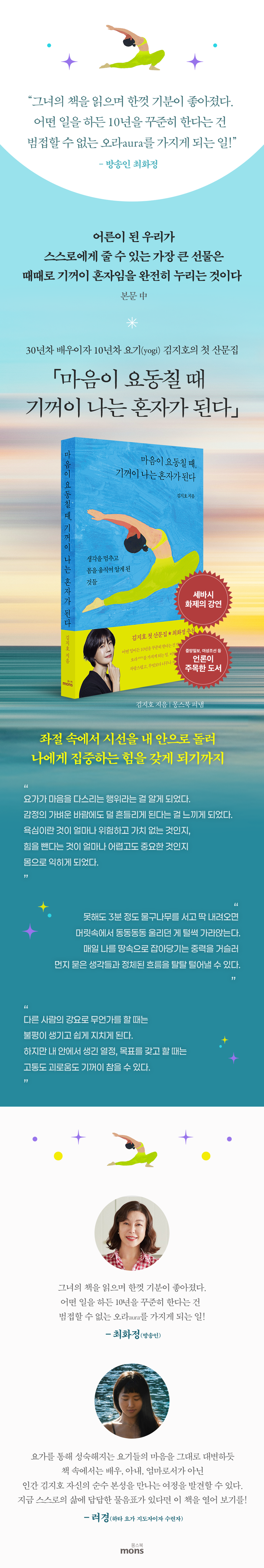10년째,요가와명상하는생활화장기없는말간얼굴로매트위에서혼자요가를하는김지호의모습은30년전방송에처음등장했던그녀를만나던순간과비슷한느낌이다.여름같은청량한미소와기존의배우들과는어딘가다른,씩씩한소년같기도한모습그대로.톱배우로살며마냥우아할것만같던김지호는늘상털털하고소탈하다.먼거리도늘걷거나버스를타며어디를가든요가매트를챙겨다닌다.요가와명상을가까이한생활이벌써10년째.마음이요동칠때나불안할때도,어떤선택의순간에서도조용히혼자매트위에올라호흡을가다듬는다.분주한일상,복잡한생각들도몸을움직여집중하다보면가볍게탈탈털어낼수있다는것.요가와명상의즐거움,더불어변화하는자신의모습을기록하기시작했고최근얻은별명인‘요가전도사’답게이충만함을사람들에게도알리고싶었다.무엇보다괴로움과절망속에서도시선을내안으로돌려나에게집중하는힘을갖게되기까지의과정을많은이들과나누고싶어첫산문집을냈다.사람들의관심속에서사라지고싶던시절방송인최화정씨의추천사처럼,이책<마음이요동칠때,기꺼이나는혼자가된다>를읽으면마음이근질근질해진다.요가를하면정말이렇게된다고?흔들리는마음의동요도,일상의스트레스도단지매트위에올라서는것만으로가능해진다는게사실일까.호흡을통해나에게집중하는힘을과연갖게될수있을까.요가를만나기전,김지호는일에서도가정에서도뭔가제대로해내지못하고있다는생각에마음이무거웠었다.자존감도많이떨어져있던시기였다고한다.간간이들어오는드라마대본이나방송은죄다거절하고사람들의관심속에서사라지고싶었던10년전.배우보다엄마에집중하는삶을살기로,스스로선택한삶이었지만늘뭔가허전했다.달리기도해보고자전거도타보고화실에서도그림도몇시간씩그리며시선을돌릴다양한것들을시도해봤지만채워지지않는기분이었다.허전하고불안한마음이없어지지않았다.뭔가집중할게필요했고,운동을좋아하던그녀답게혼자서,스스로할수있는‘운동의주권’을찾아오려궁리하다가매트하나만있으면어디서든할수있는요가를해보기로했다.‘기구도필요없고오로지내몸과의지,매트이세가지만있으면충분히가능한운동.처음엔요가원의맨뒷줄,사람들눈에띄지않는곳에서눈치보며앞사람의동작을따라하기급급하던그녀였으나어느덧10년,이제는맨앞줄숙련자들곁에서게되었다.‘나좀괜찮은사람이구나’“산만하고집중력도지구력도없는내가이상하리만치요가를할때만은다른모드로변한다.어쩌면이게요가를사랑하게된이유일수있겠다.나를차분하게해주고인내하게해주는요가.생각하고움직이고느끼는감정들은모두다내것이고남이대신해줄수없다는것,‘내’가중심이라는걸깨닫게해주는요가.그리고내안의진짜나에게귀를기울이는것이가장중요하다는걸점점깨닫게해준다.”?본문에서요가를만나기전그는잘할것같지않으면시도조차하지않고회피하고도망치던사람이었다.우연한계기로방송에데뷔를하게되었고빠른시간에생각지도않은엄청난인기를얻게되었다.주어진역할은큰데,정작자신은사람들의기대에미치지못한다는자책감과부담감과초조함을달고살았다.일을즐기지못하고도망치기바빴고스스로에대한실망감에스스로에게‘나는못하는사람’이라는프레임을씌우기도했다.그러나자신을질책하던나쁜프레임도결국요가를통해극복해갔다.할수없을거라고생각했던동작을해내는과정속에서실패하고포기하고싶었지만도망치지않고다시매트위에서면서신체적인한계도극복해보고여러고비들을넘겨봤다.그런과정들을통해포기하지않고노력해서얻은작은성취감들이쌓여,어느순간‘나이걸해냈구나’,‘나좀괜찮은사람이구나’하는만족감을얻게된것이다.실천과꾸준함이가져다준변화결국변화라는건욕심을부린다고,가만히앉아서생각하고고민한다고되는게아니라몸을움직이는실천과꾸준함이가져다준다는것을알게됐다.매트위에서혼자서어렵게버티던그시간들이쌓여몸뿐아니라마음에도단단한근육이붙게된것이다.직업상늘남의시선에서자유로울수없었는데요가를하며밖으로향해있던시선을안으로돌리고나에게집중하는시간들을경험했고그시간들이그녀를자유롭게만들어주었다.이제는안되는것에대해부끄러움없이도전하고노력하게되었고그래서뭔가를다시해볼수있는힘이생겼다.“내안에서생긴열정,목표를갖고할때는고통도괴로움도기꺼이참을수있다.밖을향한시선을내안으로가지고오는훈련.조금씩달라지고힘이생기고건강해지는변화속에단단해진다.”?본문에서