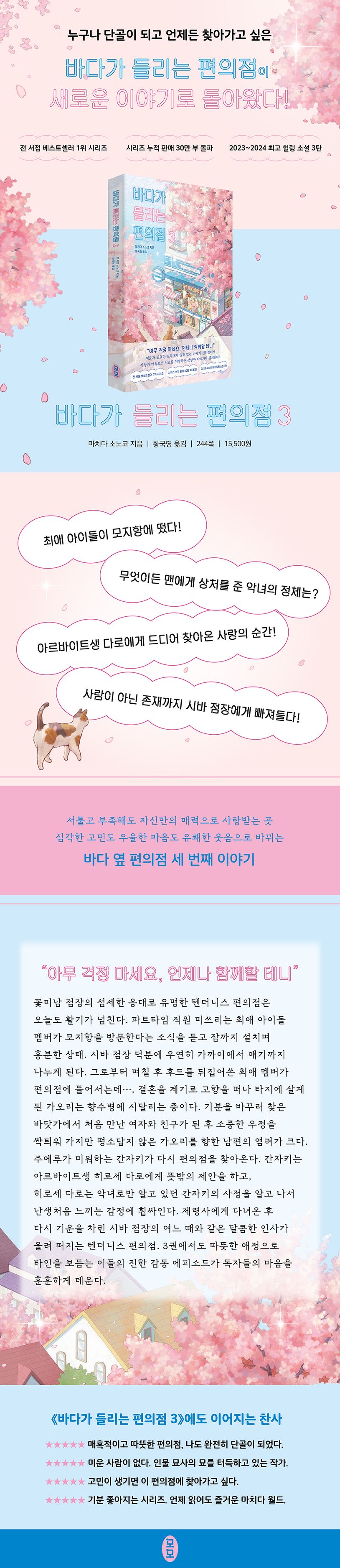 감동 힐링 분야의 화제 시리즈, ‘바다가 들리는 편의점’이 더욱 흥미로운 에피소드, 한층 더 매력적인 등장인물들과 함께 세 번째 이야기로 돌아왔다. ‘바다가 들리는 편의점’은 만화 속 캐릭터처럼 개성 넘치는 편의점 직원들을 중심으로 우리 주변에서 쉽게 만날 수 있는 평범한 이웃들이 저마다의 사연에 공감하며 손을 내밀고 맞잡는 과정을 통해 독자들에게 따뜻한 위로를 안겨 주는 연작 소설이다. 또한 지난 2023년 1, 2권 출간 직후 한 달 만에 전 서점 베스트셀러 목록에 올랐으며, 1, 2권 통합 30만 부가 넘게 팔리는 등 서점가에 또 한 번의 ‘편의점 열풍’을 몰고 온 인기 시리즈이기도 하다.