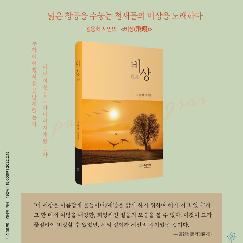 김응혁 시인의 시선집 『비상(飛翔)』이 푸른사상사에서 출간되었다. 완주 삼례 출신인 시인은 지역을 향한 애정과 고향에 서린 아름다운 추억, 고향 땅에서 벌어진 역사적 비극의 현장에서 찾아낸 선조들의 흔적을 노래한다. 가문의 역사를 넘어 민족의 애환까지 담아내는 이 시집은 깊은 감동을 준다.