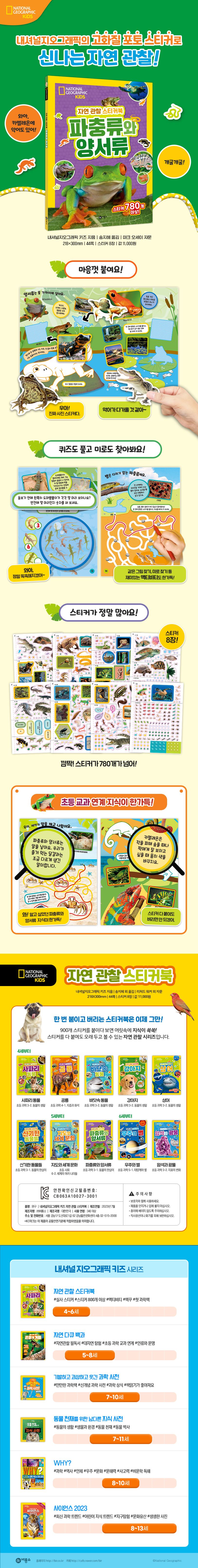 페이지를 넘겨 입이 큰 악어, 눈이 초롱초롱한 청개구리, 변신의 귀재 카멜레온 등 생생한 파충류와 양서류 포토 스티커를 붙여 보세요. 또, 궁금했던 강아지들의 주요 정보를 큼직한 사진과 쉽고 짤막한 설명으로 접해 보세요. 어느새 자연 관찰 지식도 머릿속에 쏙쏙 채워져요. 이 시리즈는 스티커를 다 붙여도 버릴 수가 없는, 초등까지 두고두고 꺼내 볼 수 있는 알찬 자연 관찰 스티커북이랍니다.