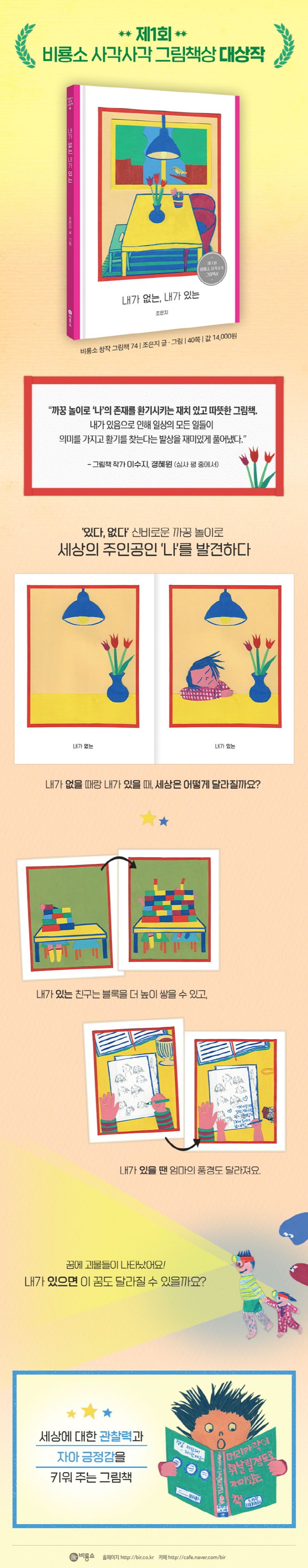 첫 번째 수상작 『내가 없는, 내가 있는』은 양쪽으로 나란히 펼쳐진 내가 ‘있는’ 장면과 내가 ‘없는’ 장면을 비교하며 세상의 주인공인 ‘나’를 인식해 가는 그림책으로, 대상의 영속성을 배우며 인지적, 정서적 발달을 촉진하는 까꿍 놀이와 닮았다. 심사를 맡은 이수지, 경혜원 작가는 ‘‘’있다, 없다‘는 항상 신비로운 까꿍 놀이다. 거기에 있었던 것이 다음에는 없고, 없었는데 다시 있다는 이 단순한 놀이는 언제나 아이들을 기쁘게 한다. 경쾌하게 짧은 상황을 반복하다가 마지막 장면을 넓게 펼쳐 보여 여운을 주는 방식도 좋다. 재치와 따뜻함이 리듬감 있게 차곡차곡 잘 쌓인 책이다. 유아를 위한 그림책에 충실하면서도 모든 연령에 어필할 수 있는 그림책의 매력을 두루 보여 주었다.”라고 평했다.