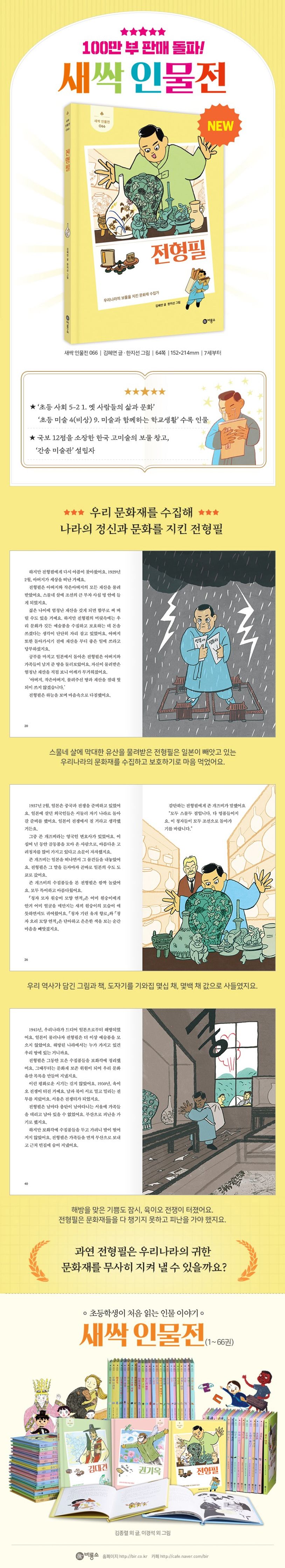 초등학생이 처음 읽는 인물 이야기 「새싹 인물전」 시리즈의 66권 『전형필』이 ㈜비룡소에서 출간되었다. 우리나라의 수많은 국보와 보물을 지켜 낸 문화재 수집가 전형필의 일생을 어린이의 눈높이에 맞게 담았다. 전형필은 현재 초등 사회 5학년 교과서와 미술 4학년 교과서(비상), 중등 국어 3학년 교과서(비상)에 수록되어 있는 인물로, 『훈민정음(해례본)』, 신윤복의 『혜원풍속도』, 「청자 상감 운학문 매병」 등 교과서에 나오는 국보급 문화재들을 소장하고 있는 간송 미술관의 설립자이다.