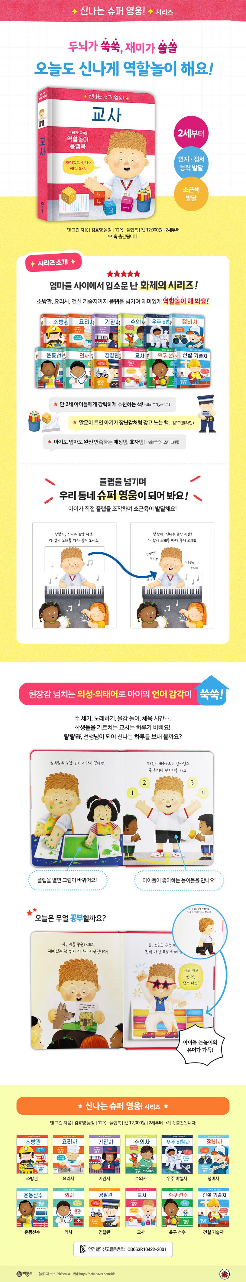 플랩을 열면 그림이 바뀌며 강력한 몰입감을 선사하는 신개념 플랩북 「신나는 슈퍼 영웅!」 시리즈. 세계적인 출판사 LADYBIRD BOOKS에서 출간한 원작 시리즈는 마치 주인공이 된 것 같은 생생함과 세련된 디자인으로 이미 전 세계 여러 나라에서 큰 인기를 얻고 있지요. 이번엔 『교사』를 만나 봐요. 장난감을 가지고 노는 것처럼 재미있는 이 시리즈는 손과 눈의 협응력, 미세한 손의 운동 능력 등 소근육 발달에 그만이랍니다.