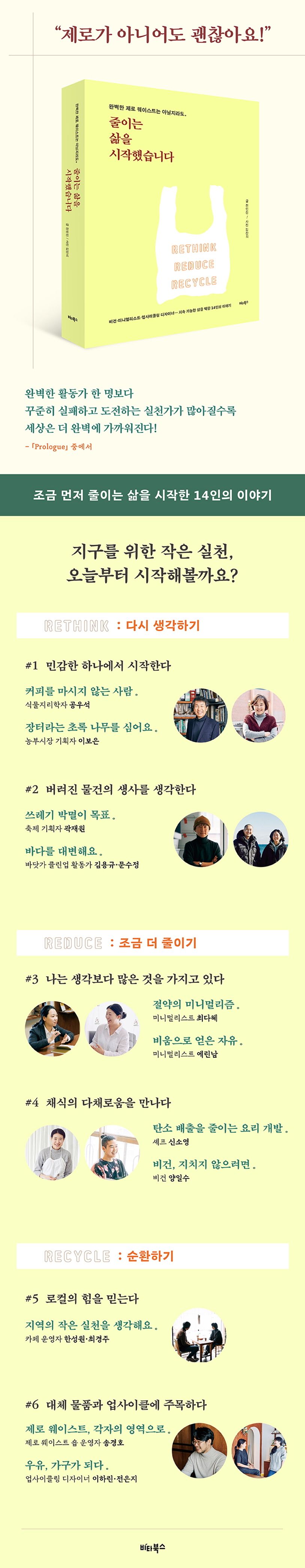 저자는 제로 웨이스트 개념을 얼핏 알고 있더라도 선뜻 마음먹지 못하는 사람들을 위해 이 책을 썼다. 누구 못지않게 소비 지향적인 삶을 살았던 보통의 존재, 하지만 어느 날 이 청년은 ‘나와 내가 사랑하는 사람들, 지구’가 끈끈히 이어져 있음을 깨달았다. 그렇게 그는 환경에 진심인 소수가 되었다. 그렇다고 단 한 번의 실패도 없이 지구에 보탬에 되었느냐 하면 그건 아니다. 비건을 실천하면서도, 지구에 해를 덜 입히는 세제나 샴푸를 사용하다가도, 일회용품 없는 장보기를 실현하다가도 자주 고비가 찾아왔다. 때마다 넘어졌고 적당히 타협했다. 그럼에도 죄책감을 털고 일어나 다시 도전할 수 있었던 건 개인의 작은 움직임이 결국 사회로 연결된다는 일말의 믿음이 있었기 때문이다. 그렇게 저자는 좌충우돌 초보 제로 웨이스트의 삶을 유지하기로 했다. 그리고 비슷한 생각으로 삶의 작은 부분을 실천하는 14인을 만났다. 각자 다른 분야에서 지구를 생각하는 이들의 이야기에 귀 기울여보자.