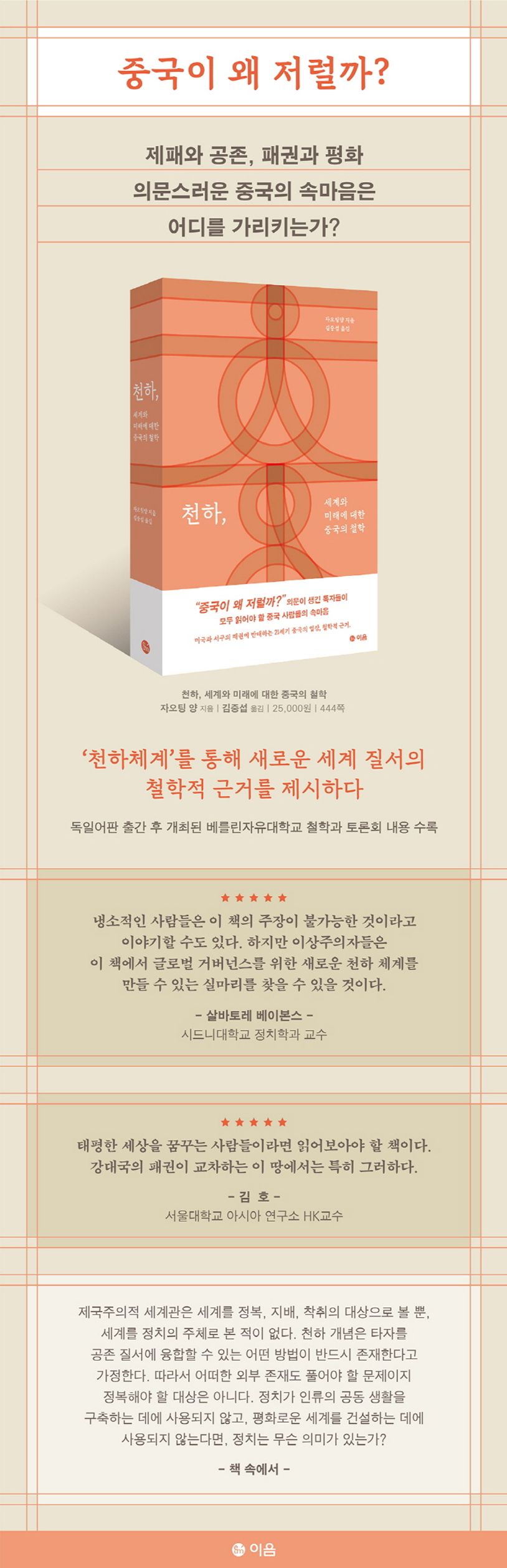 『천하, 세계와 미래에 대한 중국의 철학』은 중국의 주요 정치철학자이자 ‘천하주의’의 가장 중요한 이론가 자오팅양의 신작이다. 2005년에 발표해 전 세계적으로 ‘천하’ 담론을 형성했던 『천하체계』를 추가 보완하고 후속 연구내용을 추가했다. 자오팅양은 약 3000년 전 주나라의 세계 정치 질서인 ‘천하’로부터 지금의 ‘엉망이고 형편없는 실패한 세계’를 구할 해답을 모색한다. 투쟁 대신 공존, 개인 대신 타인, 충돌 대신 포용을 추구하는 ‘천하체계’는 비록 현실적 실행방안이 부족한 이상에 불과할 수 있으나, ‘정치는 세계를 존중해야 한다’는 제안이 과연 불가능에 머물러야 하는지 되묻게 한다.