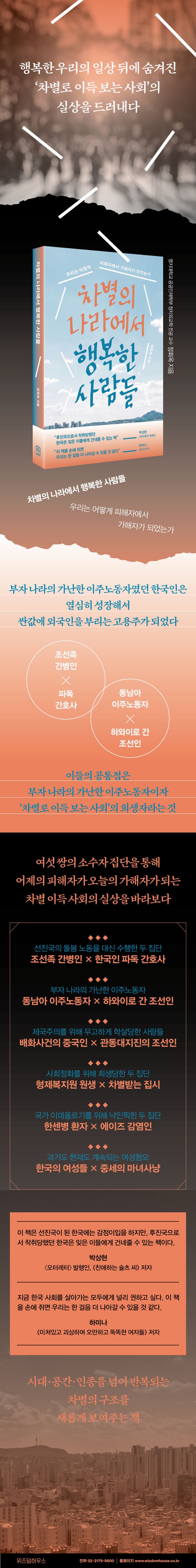 시대·공간·인종을 넘어 반복되는 차별의 구조를 새롭게 보여주는 책. 다문화와 소수자 문화를 연구하는 정치학자 정회옥은 우리가 누리는 평온한 일상이 얼마나 차별적인 구조 위에서 세워졌는지 분석한다. 조선족 간병인과 파독 간호사, 동남아 이주노동자와 하와이의 조선인, 배화사건의 화교와 관동대지진의 조선인 등 여섯 쌍의 소수자 집단은 시대와 공간을 달리하지만, 국가와 사회를 위해 놀라울 정도로 유사하게 희생당한다. 이 책을 통해 우리는 ‘차별’은 단순한 혐오 감정이 아니라, 사회가 필요로 하고 제도가 유지해온 시스템이란 것을 깨닫게 된다.
