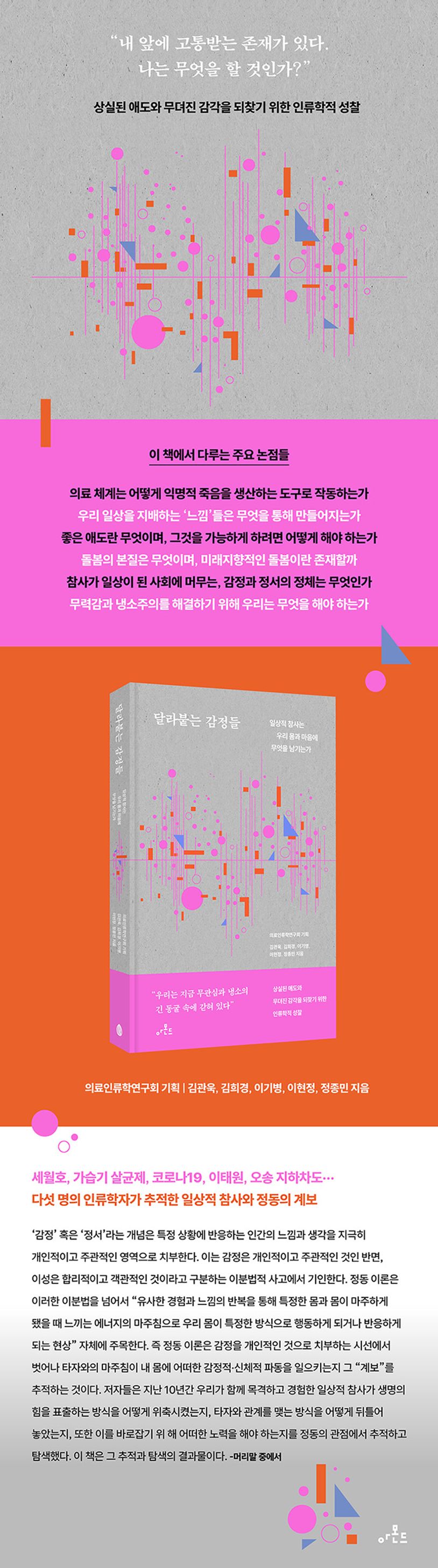 덕성여대문화인류학과김관욱,경북대학교고고인류학과김희경,한림대학교의과대학춘천성심병원이기병,서울대학교인류학과이현정,전남대학교글로벌디아스포라연구소정종민등‘의료인류학연구회’에소속된다섯명의인류학자가,《달라붙는감정들》에서일상을무대로연이어벌어진참사의궤적속에놓여있는우리의안부를묻는다.저자들은반복되는참사속에서,우리각자의삶에끈적하게엉겨달라붙는감정이나정서를‘정동(affect,情動)’이라명명하며이를추적한다.책에따르면정동은‘감정’과‘정서’를만들어내는원형적이고근원적인힘이다.즉‘슬프다’,‘기쁘다’,‘괴롭다’,‘우울하다’같은도드라진이름이붙기이전의원초적인감정적,정서적에너지다.