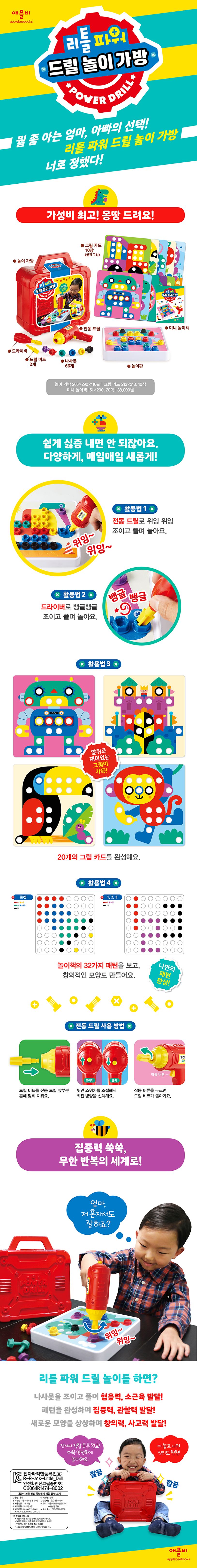 전동 드릴, 드라이버, 나사못, 놀이판, 그림 카드, 미니 놀이책이 들어 있어요. 드릴 비트를 전동 드릴 앞부분 홈에 맞춰 끼우고, 작동 버튼을 누르면 전동 드릴이 위잉위잉~ 돌아가요. 지루할 틈 없는 무한 반복 드릴 놀이를 해 보세요.