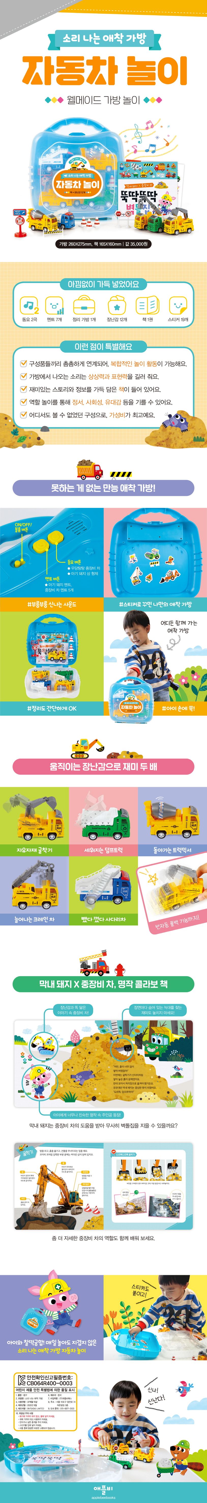 정리 가방, 장난감 12개, 책, 스티커 19개 등을 아낌없이 가득 넣었다. 정리 가방에서 흘러나오는 신나는 멘트 7개와 동요 2개가 다른 구성품들과 촘촘하게 연계되어 복합적인 놀이 활동이 가능하다. 자동차를 뒤로 살짝 당겼다 놓으면 앞으로 씽씽 나아가는 풀백 기능이 있다. 또한 돌아가고, 늘어나고, 세워지는 등 자동차를 조작하며 더욱 풍성하게 놀이할 수 있다.