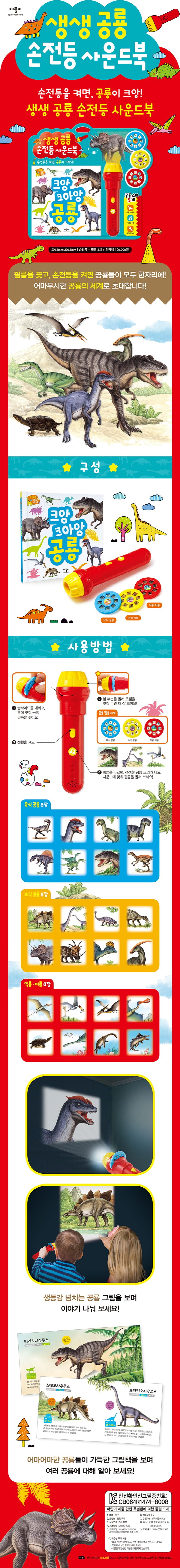 손전등을 켜면, 우리 아이들이 좋아하는 공룡들을 만나볼 수 있어요. 공룡들의 모습을 더 생동감 있게 느낄 수 있도록 공룡 효과음도 함께 구성했지요.