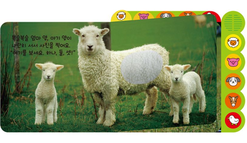 동물들의 울음소리를 듣고 촉감도 느낄 수 있는 촉감 사운드북입니다. 생생한 동물 사진을 보며 같은 동물의 얼굴이 그려진 소리 버튼을 하나씩 누르면, 매매, 꿀꿀, 멍멍, 다가닥다가닥 히히힝, 꽥꽥 등 농장 동물들의 소리를 들을 수 있습니다. 그리고 복슬복슬한 양 털, 보드라운 말 털, 만질만질한 오리 부리 등 각 사진에 달린 촉감 부분을 만져 보며 농장 동물들의 특성을 손끝으로도 경험해 볼 수 있지요. 생생한 사진을 통해 귀여운 농장 동물의 생김새를 익히고, 사진 속 동물들이 무얼 하고 있는지 살펴보며 동물들의 생태도 살펴볼 수 있습니다. 또 의성어와 의태어가 담긴 짧은 문장을 반복하여 읽으며 어휘력도 기를 수 있지요. 보고, 듣고, 만지며 익히는 동물 촉감 사진책으로 아기의 오감을 발달시키고, 동물들과 친숙해지도록 이끌어 주세요.