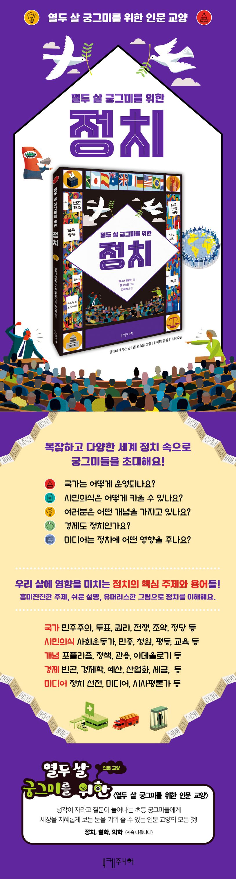 《열두 살 궁그미를 위한 인문교양》의 첫 번째 책은 《정치》입니다. “우리가 숨을 쉬는 것도 정치”라는 말을 들어봤을 겁니다. 정치는 우리 삶의 가장 가까이에서 영향을 주는 것으로, 세상이 어떻게 움직이는지 알기 위해서는 정치를 알아야 합니다. 사회의 변화를 추구하기 위해서도, 전통적인 것을 유지하기 위해서도 정치를 알아야 하지요. 《정치》에는 주요한 정치 용어 100개를 다섯 가지 주제어로 나누어 소개했습니다. 한눈에 들어오는 이미지와 유머러스한 일러스트레이션이 정치를 더욱 쉽게 이해할 수 있도록 돕고 있습니다.