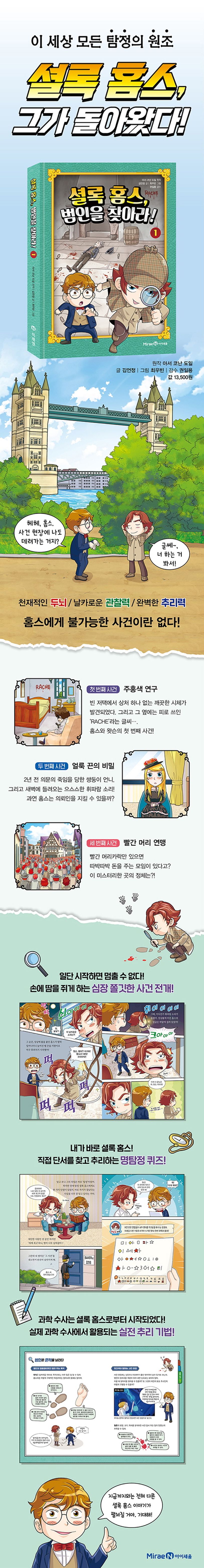 그런 〈셜록 홈스〉가 색다른 재미로 무장해 〈셜록 홈스, 범인을 찾아라!〉 시리즈로 다시 태어납니다. 그동안 발표된 4개의 장편과 아서 코난 도일이 직접 뽑은 ‘최고의 단편 12개’ 중 엄선한 에피소드를 담은 이 시리즈는 원작이 가진 강력한 스토리, 촘촘히 짜인 다채로운 그림과 만화, 사건 현장 속에서 직접 단서를 찾아보는 명탐정 추리 퀴즈로 읽는 재미와 상상력을 모두 충족시킵니다. 게다가 독자들이 좋아할 만한 프로파일링과 과학 수사 기법도 수록하여 이미 셜록 홈스를 읽은 어린이에게도 새로운 즐거움을 선사합니다.