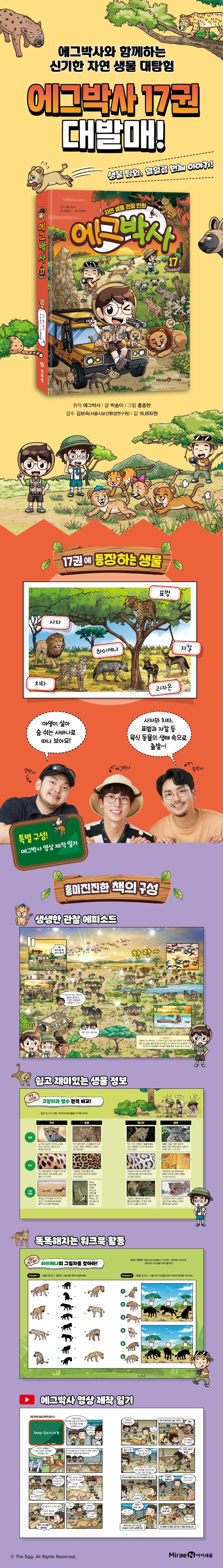 《에그박사 17》은 인기 키즈 크리에이터 에그박사의 원작 영상을 생생한 관찰 스토리와 귀여운 생물 도감으로 재구성한 자연 생물 관찰 만화입니다. 과학자, 철학가, 예술가의 눈으로 곤충의 삶을 관찰했던 프랑스의 곤충학자 파브르의《곤충기》처럼 에그박사의 눈으로 바라본 신비롭고 놀라운 자연 생물의 이야기가 가득하지요. 주인공 에그박사와 양박사, 웅박사가 자연을 누비며 신기한 생물들을 관찰하는 짜릿한 메인 스토리와 의인화된 생물들의 서브 스토리의 구성은 자연에 대한 따뜻한 정서 공감을 끌어냄과 동시에 어린이들의 탐구 본능을 일깨워 줄 것입니다. 또한 중간중간 수록된 생물 퀴즈 게임, 생물 도감 그리기, 관찰 보고서 작성하기 등 다양한 워크북 활동은 어린이 독자들의 탐구력과 집중력, 사고력을 높여 줄 것입니다.