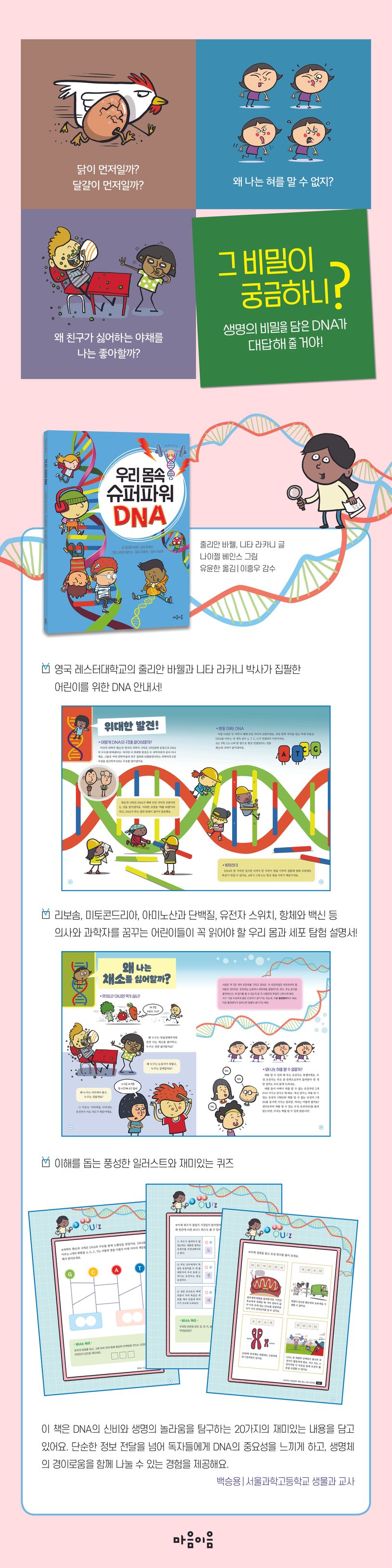 『우리 몸속 슈퍼파워 DNA』는 영국 레스터대학교의 유전학과 교수이자 의사인 줄리안 바웰과 소아과를 전공한 유전학 박사 니타 라카니가 공동 집필한 도서로 DNA에 대한 20가지 궁금증에 대한 답을 아이들 눈높이에 맞게 알기 쉽게 알려 주는 형식으로 구성되었다.