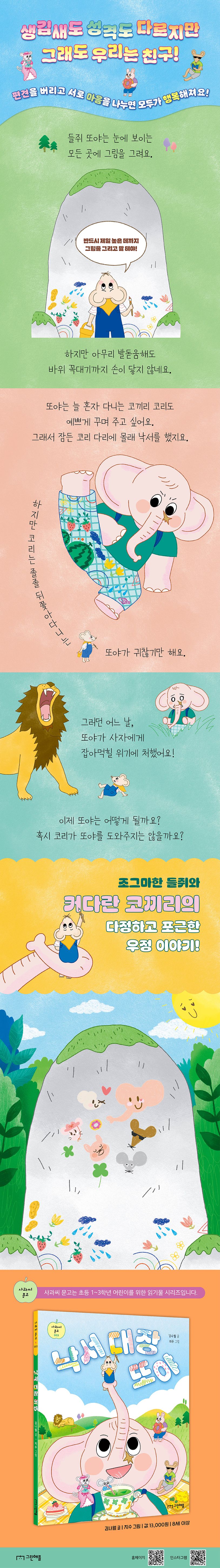재미있는 이야기를 통해 삶의 지혜를 전하는 〈사과씨 문고〉, 세 번째 책은 다른 모습이어도 마음을 나누면 소중한 친구가 될 수 있다는 사실을 일깨워 주는 조그마한 들쥐와 커다란 코끼리의 아름다운 우정 이야기다. 들쥐 콩쥐는 눈에 보이는 곳이라면 어디든 그림을 그려야 직성이 풀린다. “또 그림 그리는 거야?”라는 말을 하도 많이 들어서 또야라는 별명이 붙었을 정도다. 한편, 밝은 회색빛의 커다란 코끼리 코리는 누구와도 어울리지 않고 항상 혼자 다닌다. 그래서 아무도 코리의 얼굴에 커다란 흉터가 있는 이유를 알지 못한다. 그저 뒤에서 “흉코”라는 별명을 붙이고, 자기들끼리 수군댈 뿐이다.