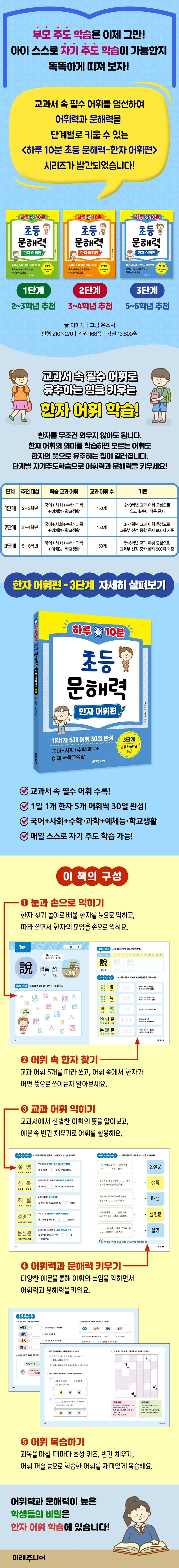 한자를 무조건 외우지 않아도 됩니다! 한자 어휘의 의미를 학습하면 모르는 어휘도 한자의 뜻으로 유추하는 힘이 길러집니다. 〈하루 10분 초등 문해력 - 한자 어휘편〉 시리즈는 국어, 사회, 수학, 과학 등 주요 교과목에서 사용하는 필수 한자 어휘를 중심으로 어휘력과 문해력을 동시에 높일 수 있는 맞춤형 커리큘럼을 제공합니다.
