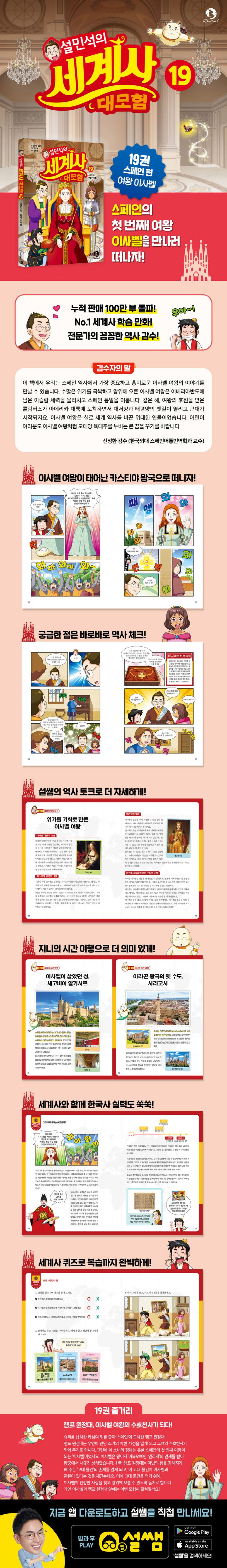 세계사는 낯설고 복잡해서 어렵기만 하다고요? 흥미진진한 세계사의 현장으로 시간 여행을 떠나, 설쌤이 들려주는 재미있는 이야기에 빠져 보는 건 어떨까요? 『설민석의 세계사 대모험』은 아이들이 꼭 알아야 할 세계사의 주요 장면을 쏙쏙 뽑아 생생하게 경험하고, 다양한 역사 인물을 만나 볼 수 있도록 구성했습니다. 또한 전문가의 꼼꼼한 감수를 통해, 스페인의 역사 정보도 알차게 담았답니다. 자, 그럼 램프 원정대와 함께 스페인의 첫 번째 여왕 이사벨을 만나러 떠나 볼까요?