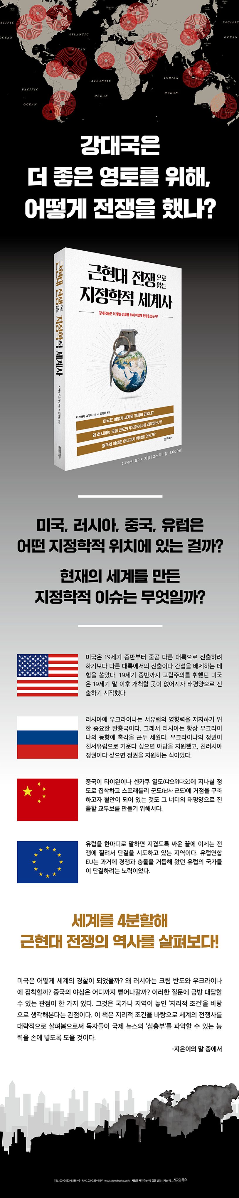 이 책은 지리적 조건을 바탕으로 중국과 러시아, 유럽, 미국으로 세계를 크게 4분할해 세계의 전쟁사를 살펴본다. ‘중국의 야심은 어디까지 확장할 것이며, 왜 러시아는 크림 반도와 우크라이나에 집착하는 것일까? 미국은 어쩌다 스스로 세계의 경찰을 자처하게 되었고, 이제는 왜 또 그것을 그만두려고 하는 걸까? 유럽은 어쩌다 EU라는 공동체로 뭉치게 되었을까?’ 이 책은 이러한 의문들에 대한 해답을 전쟁과 분쟁의 역사를 고찰함으로써 얻도록 해준다. 특히 다양한 지도와 도표, 연표를 통한 알기 쉽고 상세한 설명으로 지리적 조건과 역사적 맥락이 한눈에 들어오게 해준다.